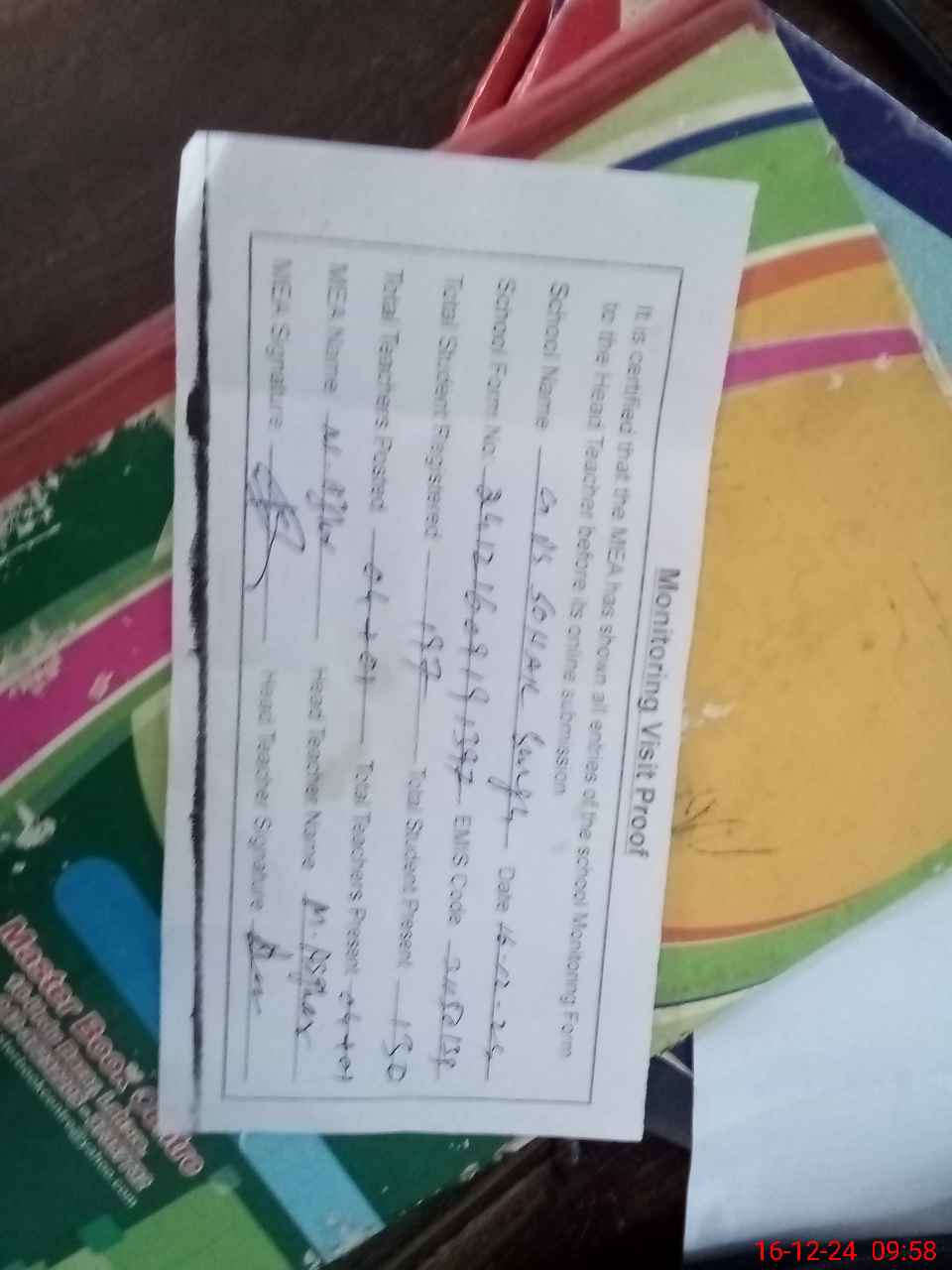 | Attendance Register | Head Teacher | MEA with School | Visit Proof |