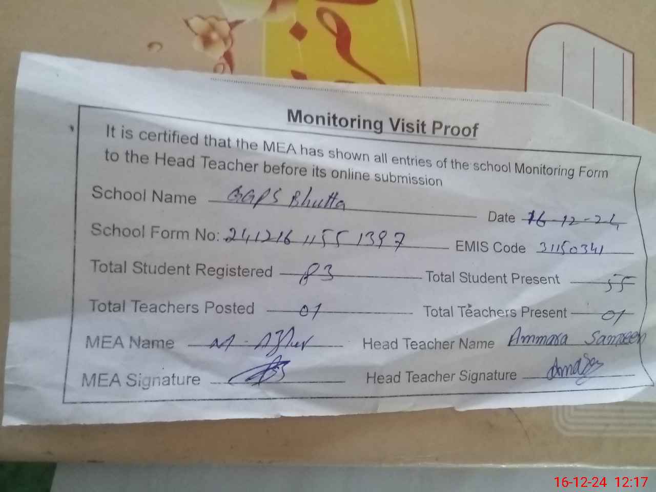 | Attendance Register | Head Teacher | MEA with School | Visit Proof |