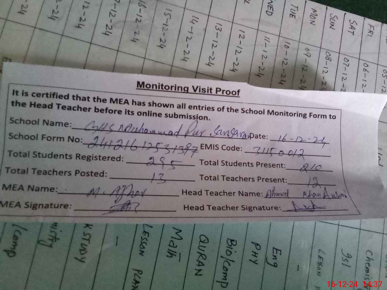 | EMIS Code: 31150012 | Name of School: GHS MUHAMMAD PUR SANSARAN | |||