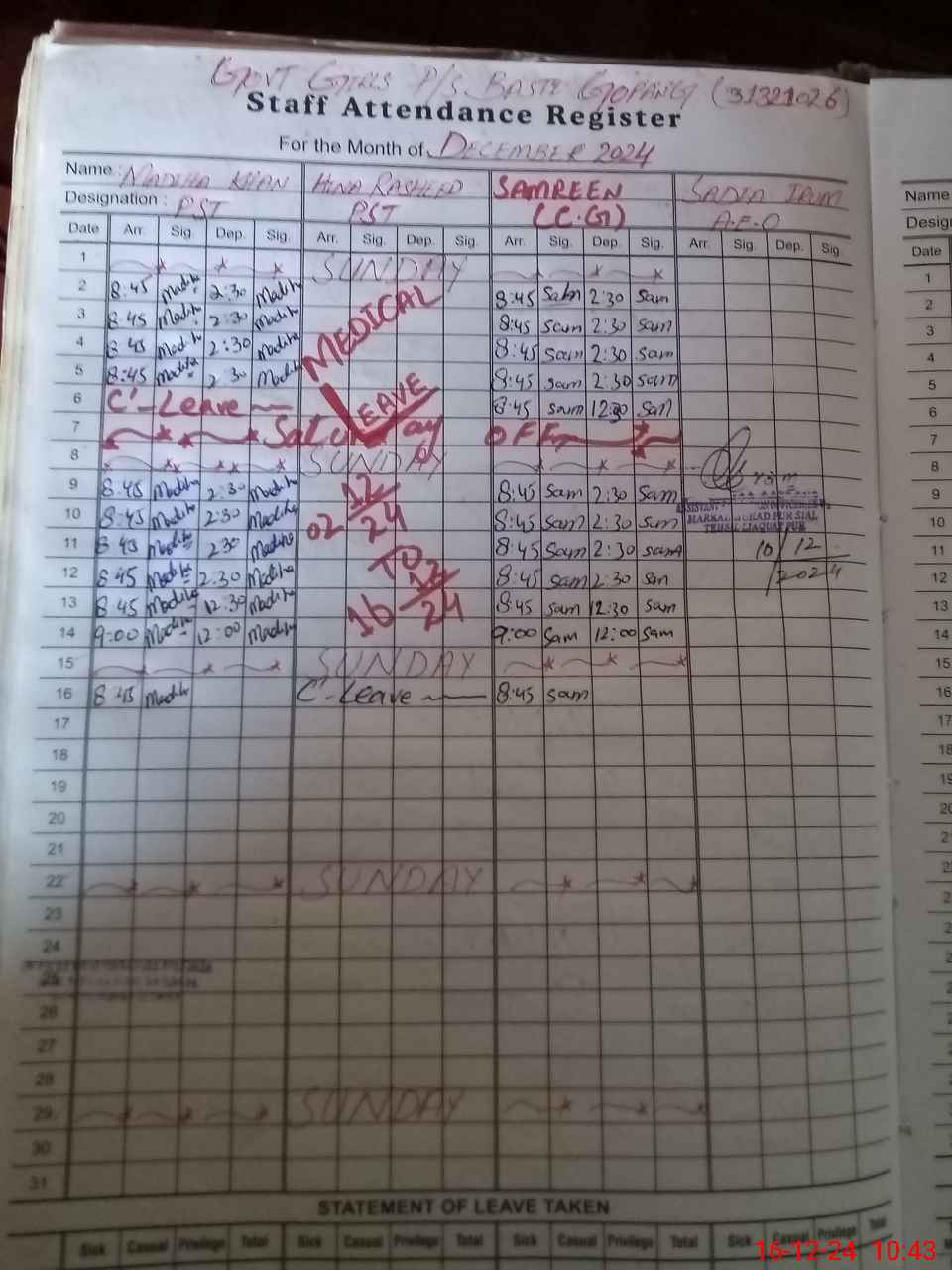 | Leave | Duty | Absent | Maternity | Medical | Ex- Pak |