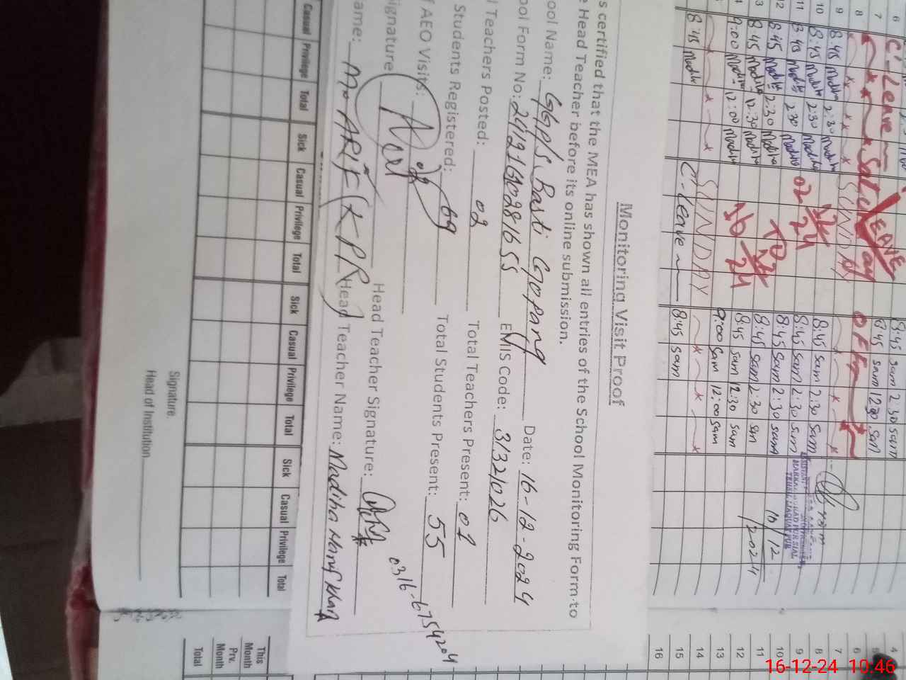 | Attendance Register | Head Teacher | MEA with School | Visit Proof |