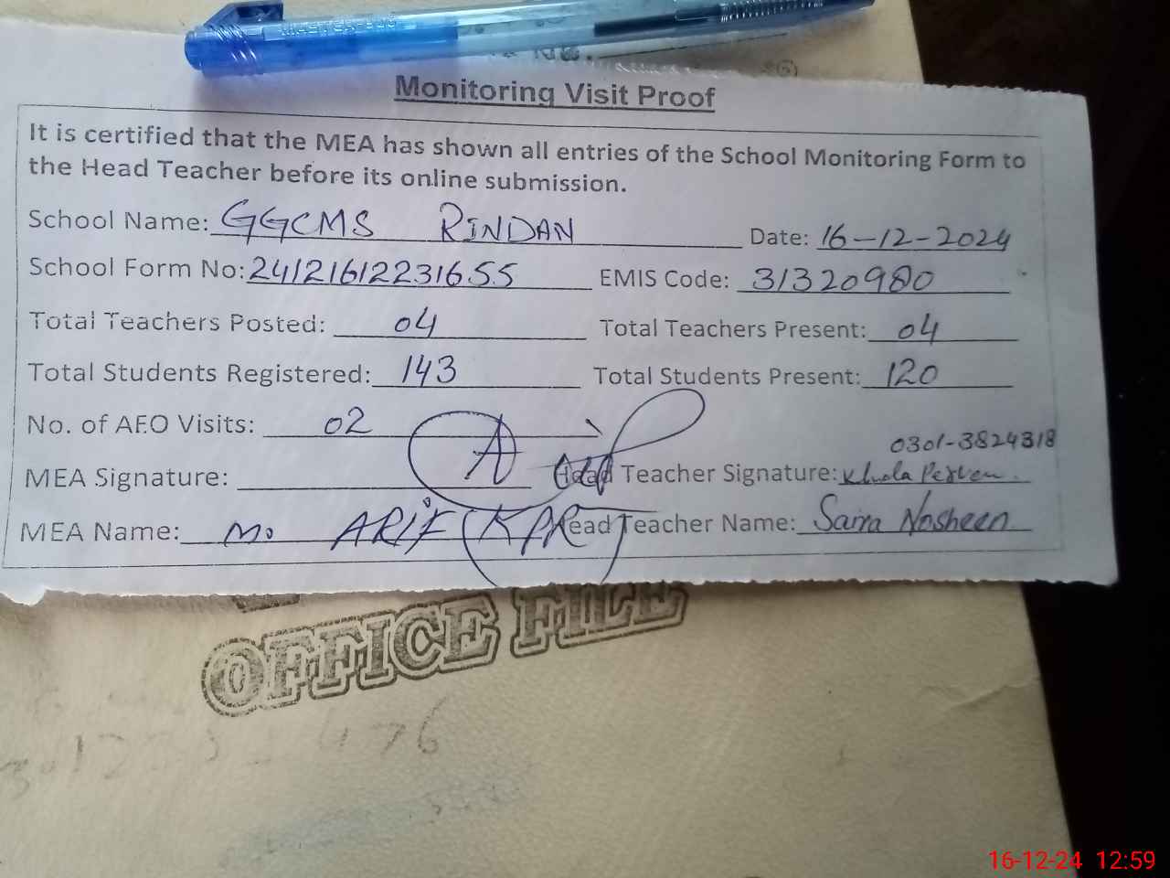 | Attendance Register | Head Teacher | MEA with School | Visit Proof |