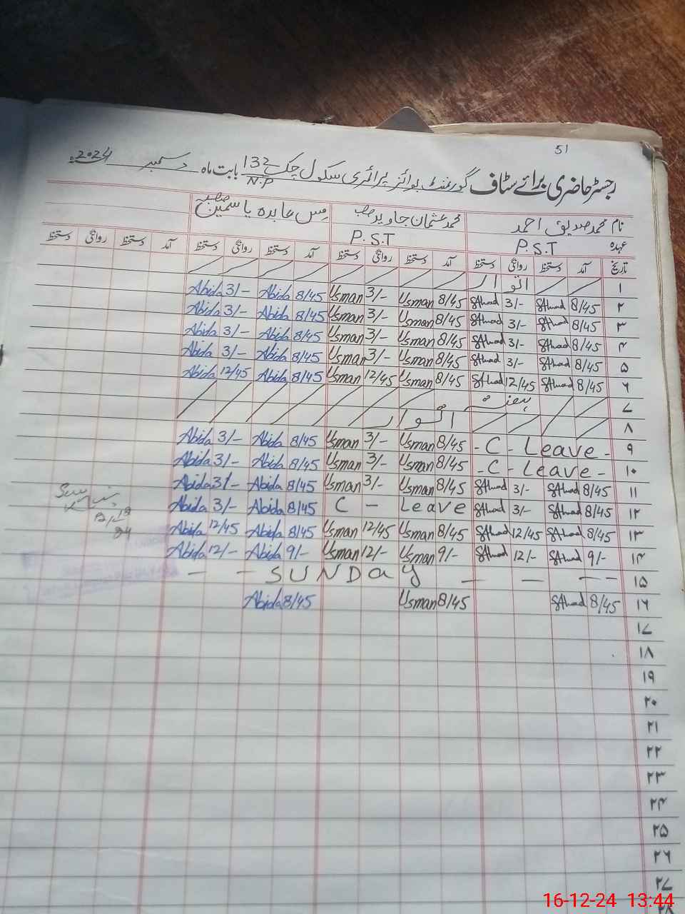| CNIC | Full Name | Designation | R/C | Absence During Last Calender Month |