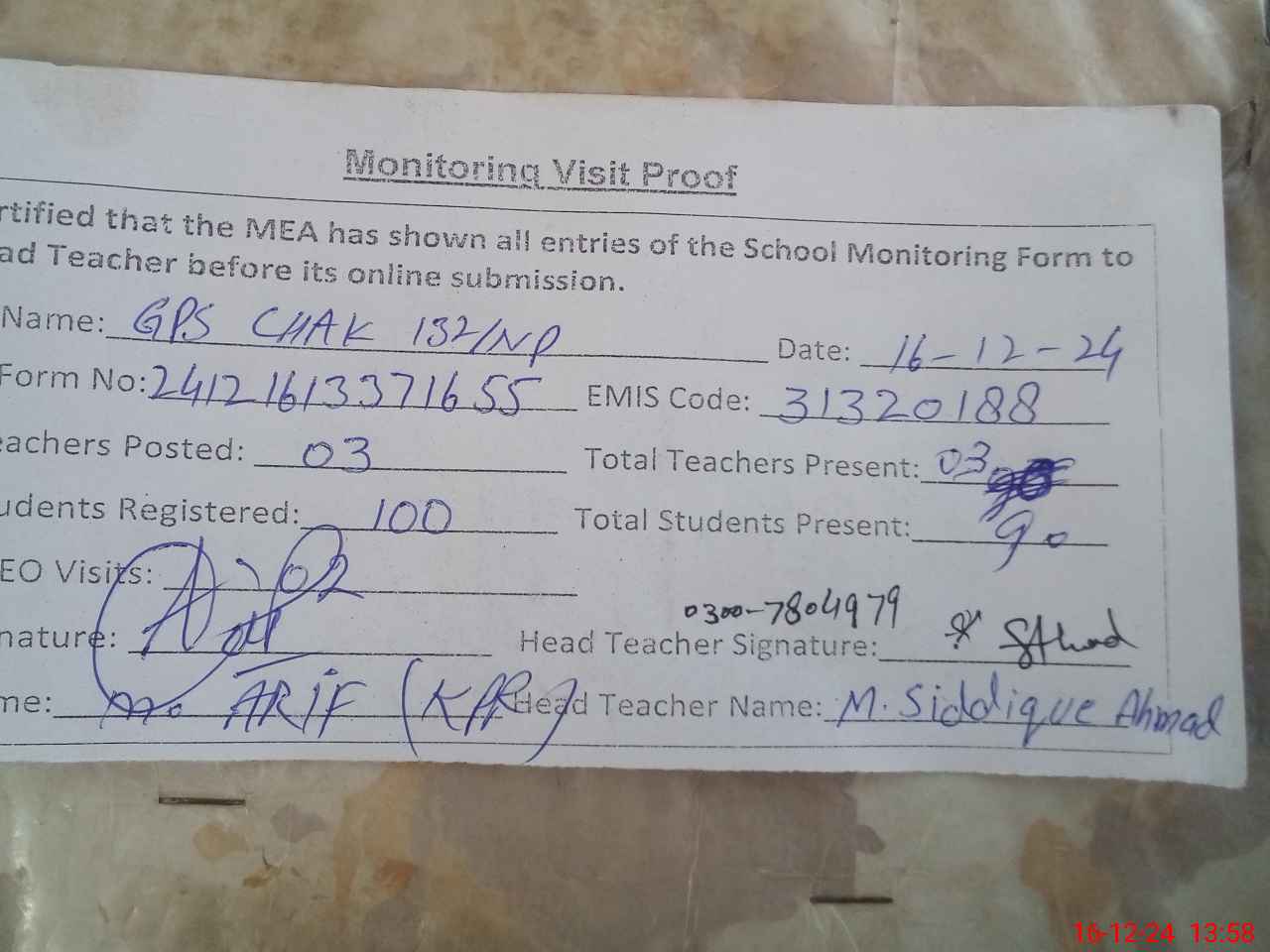 | Name: Mu**** Si**** Ah**** Designation: (School Headmaster's/Headmistress's) PST/PTC/JV Phone/Cell Number: 03**** |