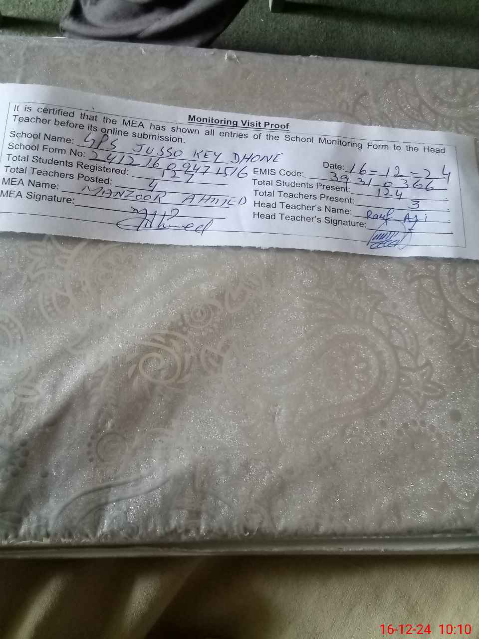 | Attendance Register | Head Teacher | MEA with School | Visit Proof |