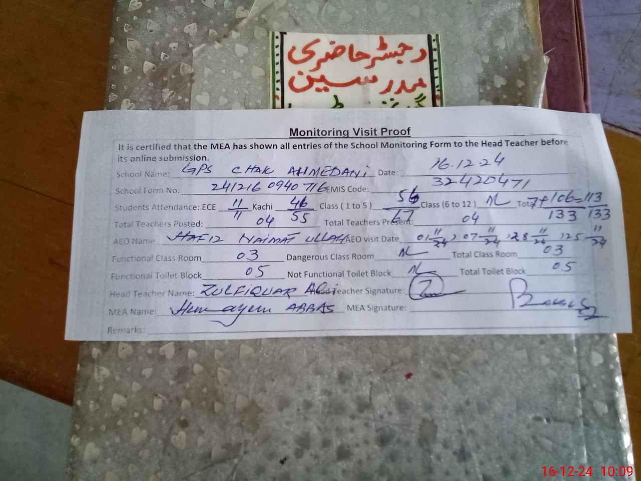 | Attendance Register | Head Teacher | MEA with School | Visit Proof |