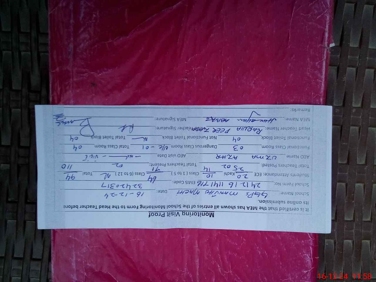 | Attendance Register | Head Teacher | MEA with School | Visit Proof |