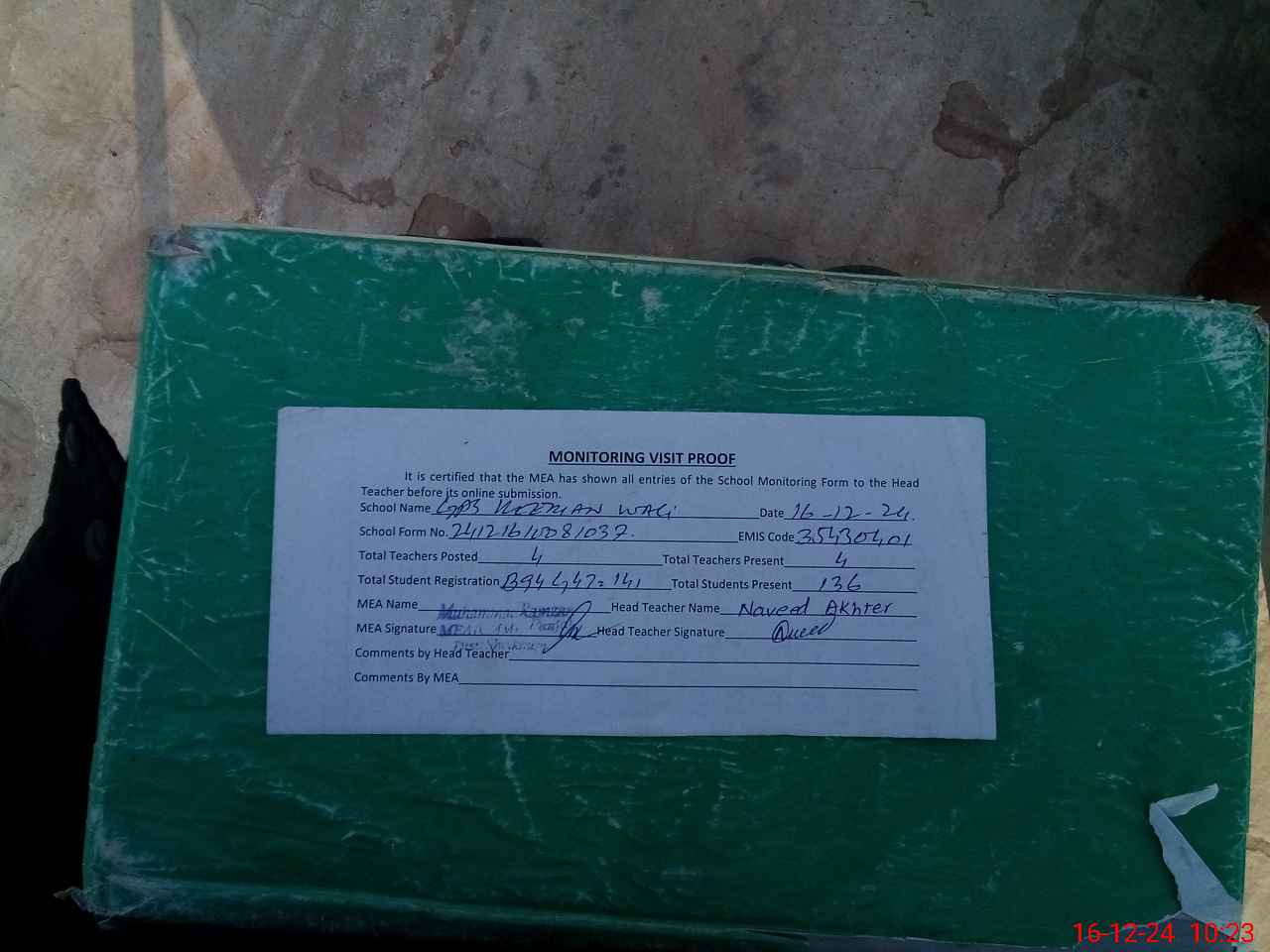 | Attendance Register | Head Teacher | MEA with School | Visit Proof |