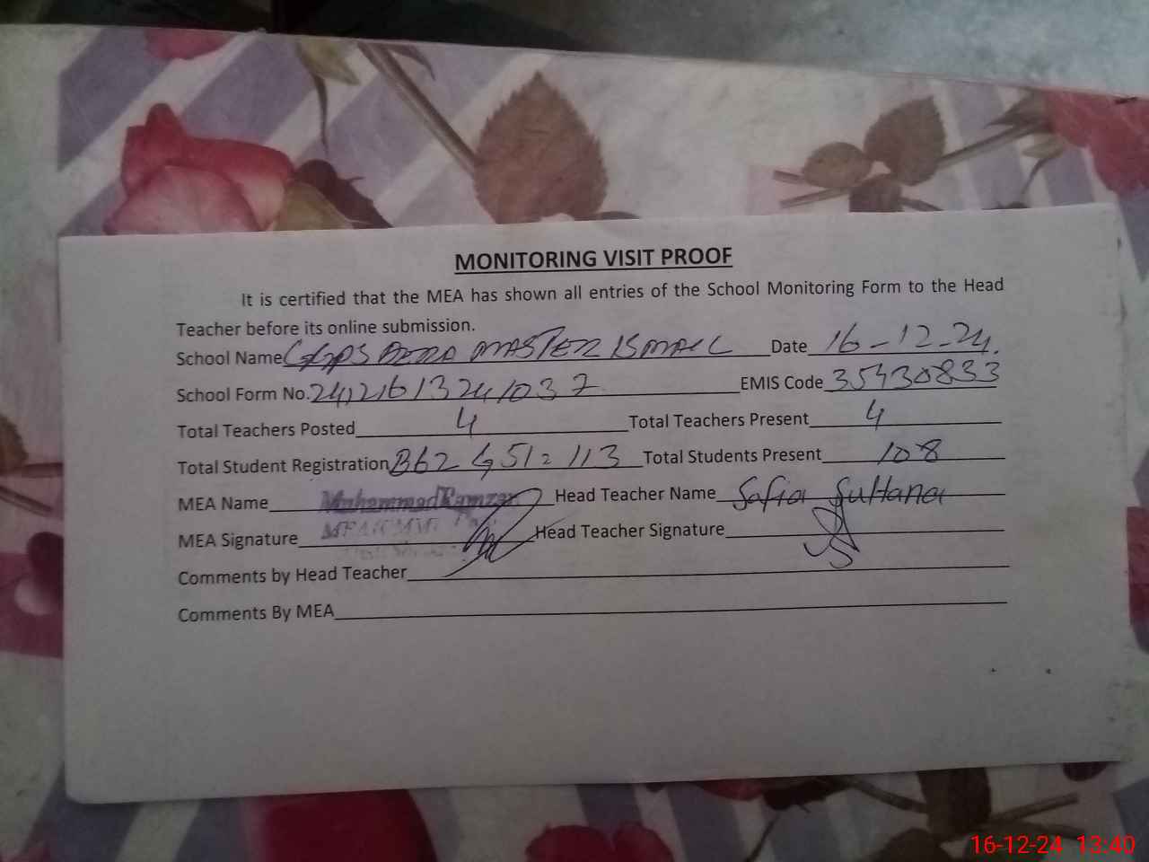 | Attendance Register | Head Teacher | MEA with School | Visit Proof |