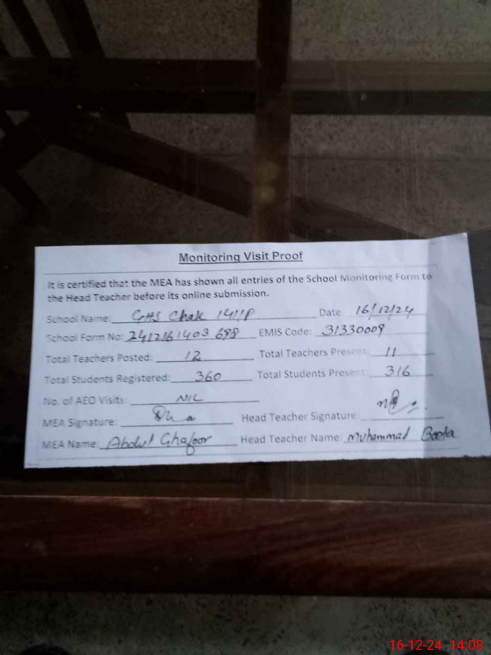 | Attendance Register | Head Teacher | MEA with School | Visit Proof |