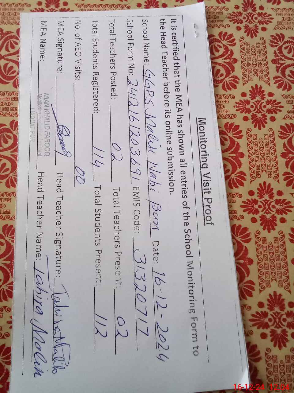 | Attendance Register | Head Teacher | MEA with School | Visit Proof |