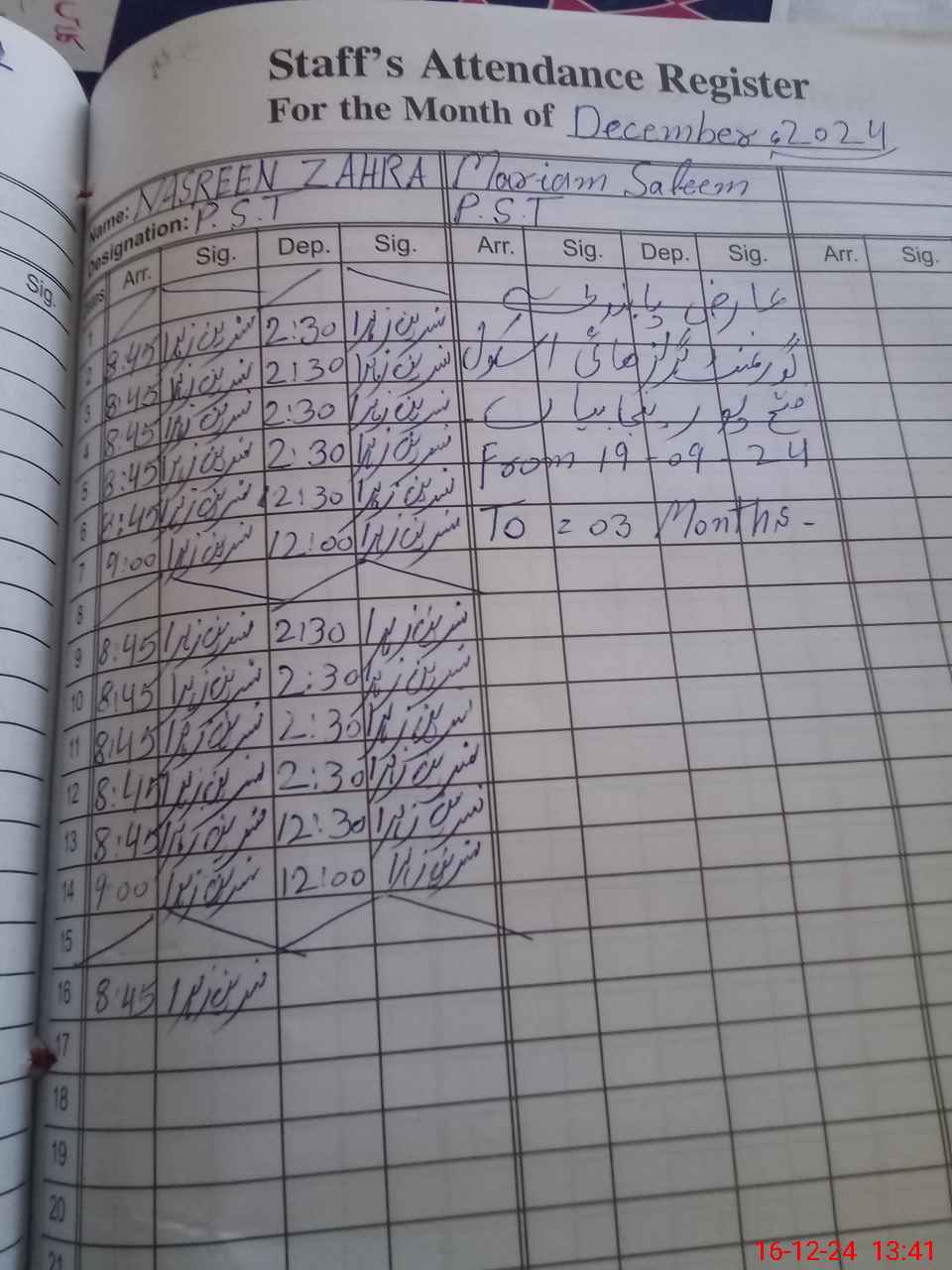 | CNIC | Full Name | Designation | R/C | Absence During Last Calender Month |