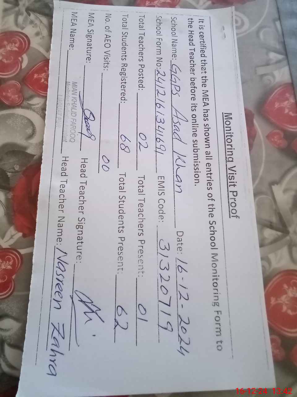 | Attendance Register | Head Teacher | MEA with School | Visit Proof |