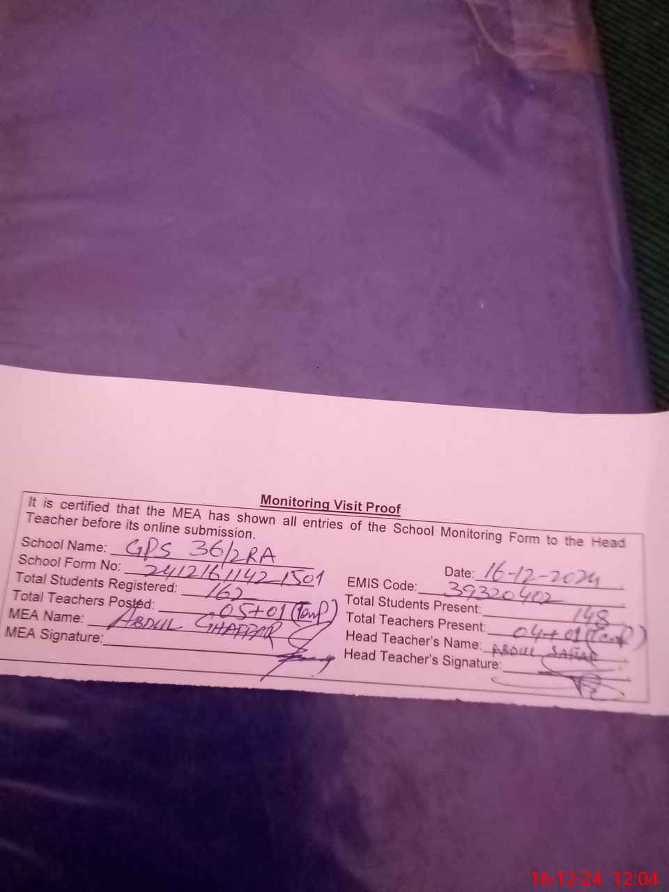 | EMIS Code: 39320402 | Name of School: GPS CHAK NO. 36/2-RA | |||