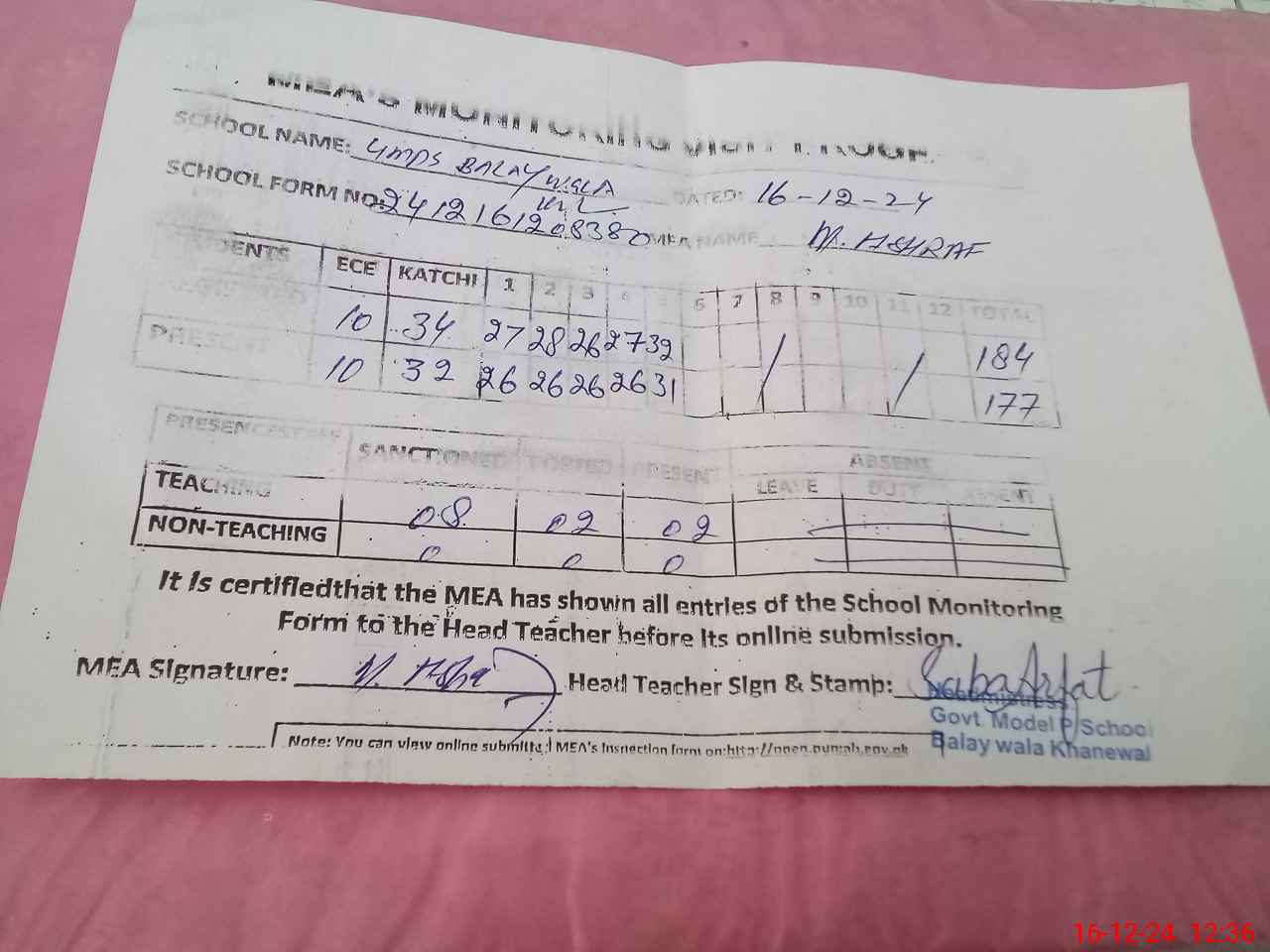 | Attendance Register | Head Teacher | MEA with School | Visit Proof |