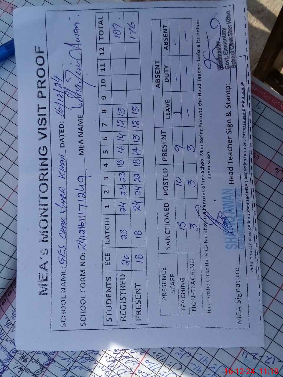 | Attendance Register | Head Teacher | MEA with School | Visit Proof |