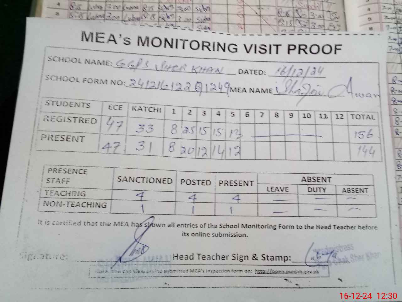 | Attendance Register | Head Teacher | MEA with School | Visit Proof |