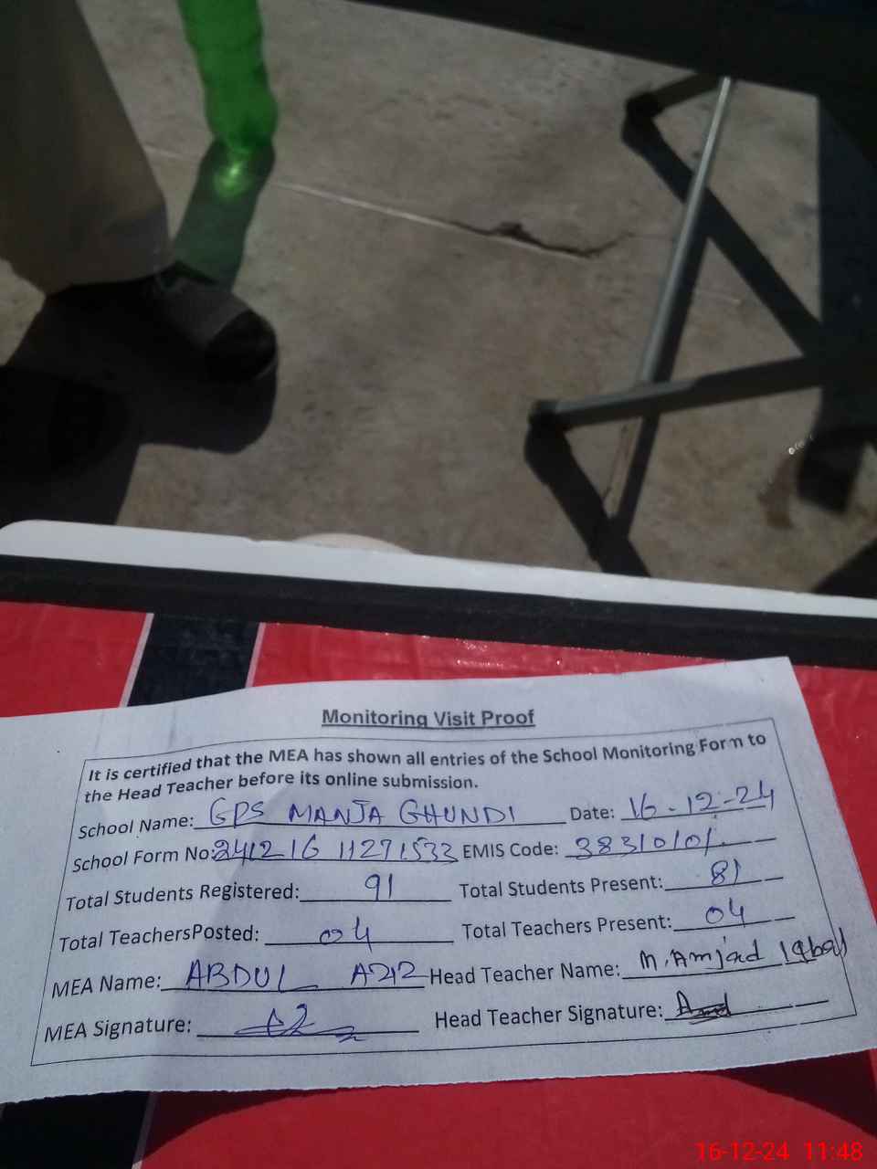 | Attendance Register | Head Teacher | MEA with School | Visit Proof |