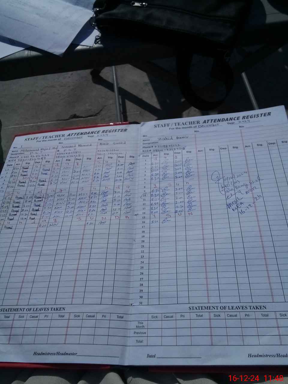 | CNIC | Full Name | Designation | R/C | Absence during last cal. month |