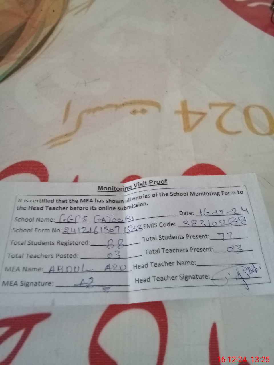 | Attendance Register | Head Teacher | MEA with School | Visit Proof |