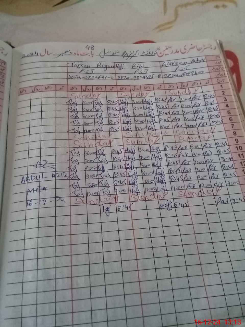 | CNIC | Full Name | Designation | R/C | Absence During Last Calender Month |