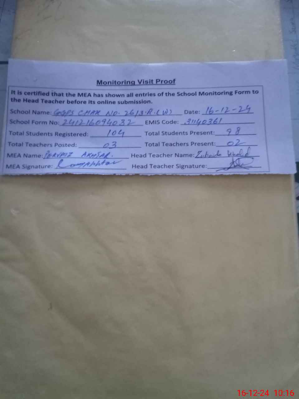 | Name: ZO**** KH**** Designation: (School Headmaster's/Headmistress's) PTC/JV Phone/Cell Number: 03**** |