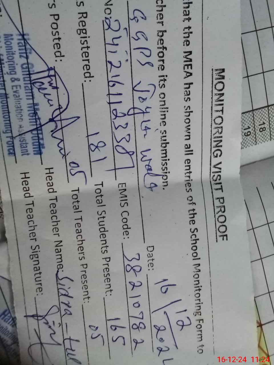 | Attendance Register | Head Teacher | MEA with School | Visit Proof |