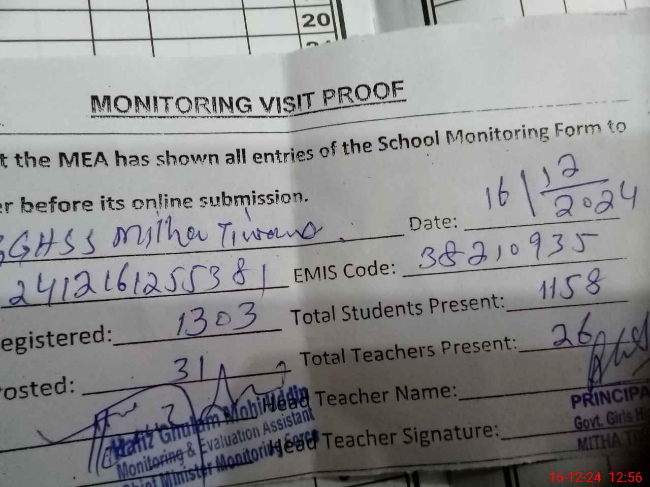| Attendance Register | Head Teacher | MEA with School | Visit Proof |