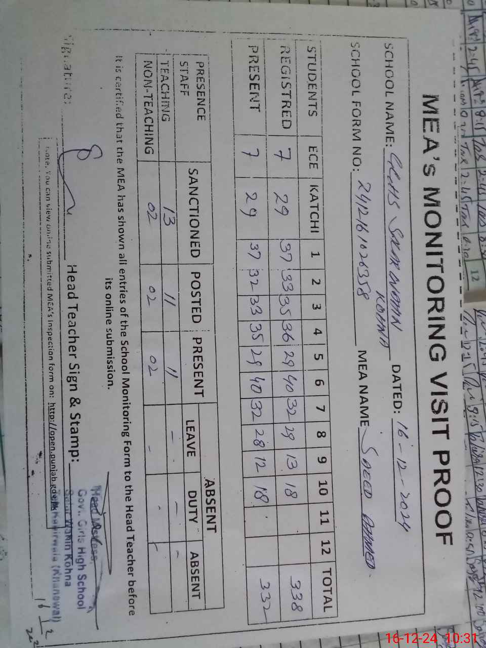 | Attendance Register | Head Teacher | MEA with School | Visit Proof |