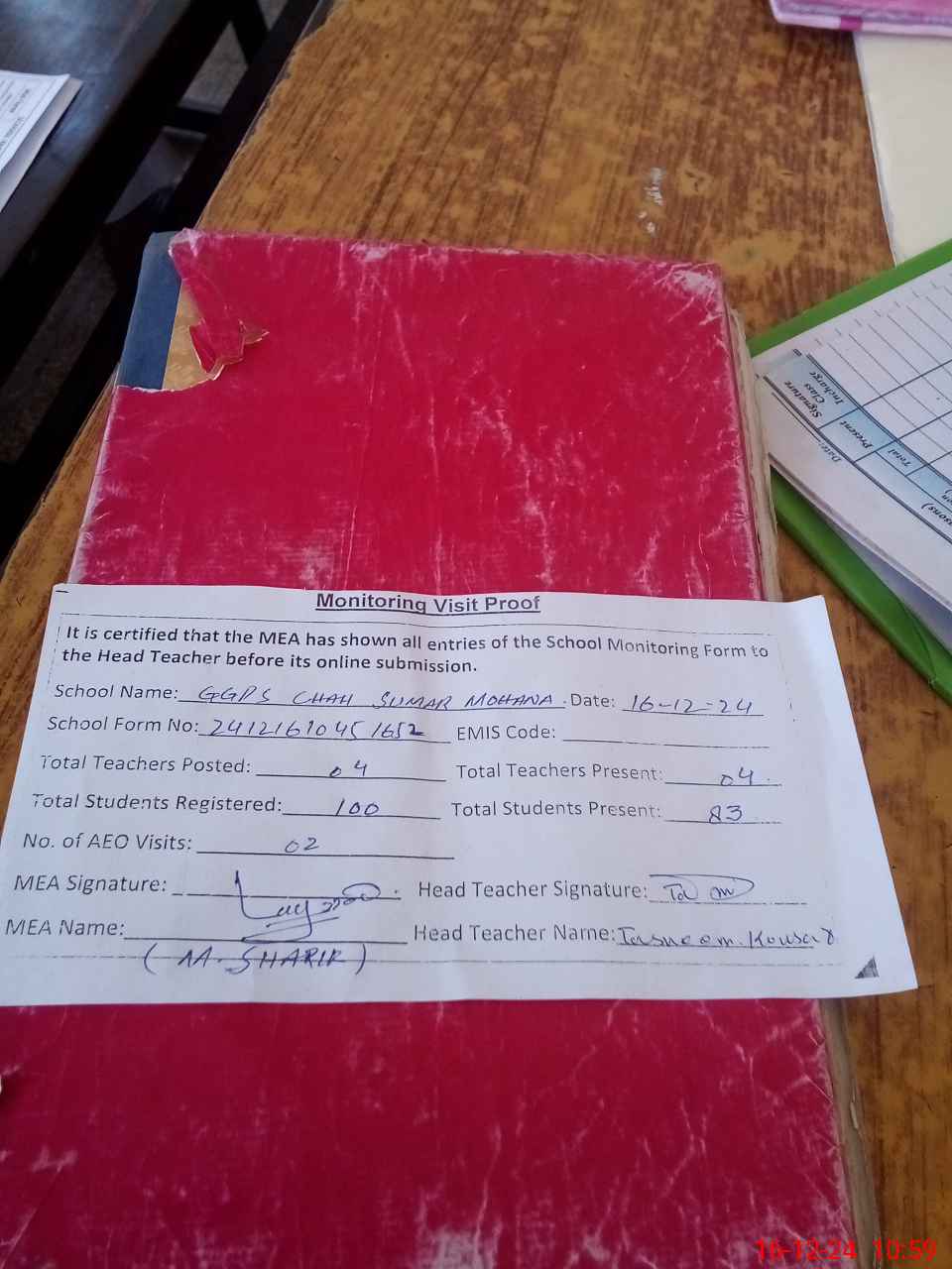 | Attendance Register | Head Teacher | MEA with School | Visit Proof |