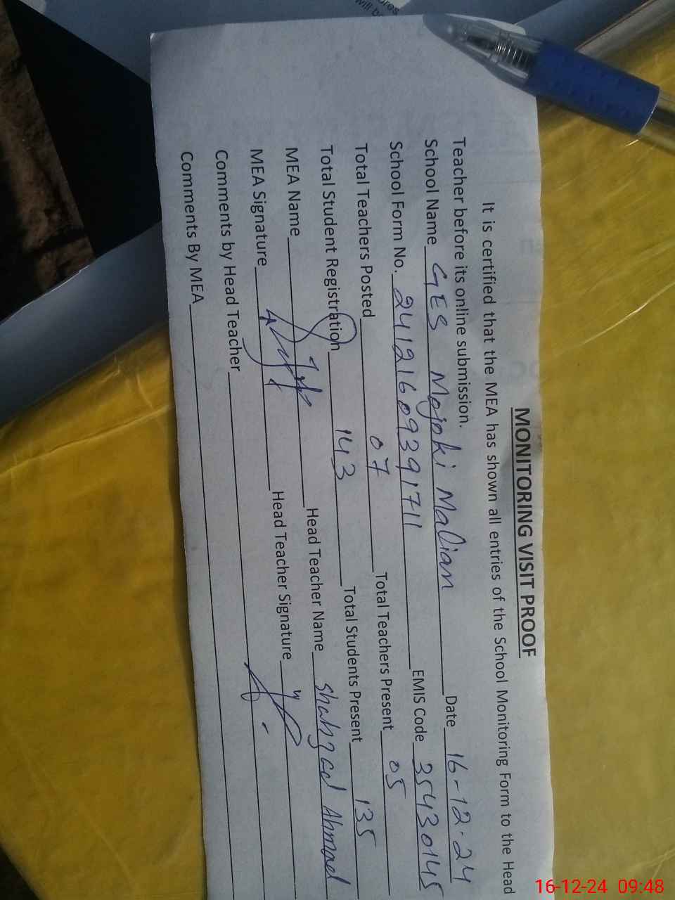 | Attendance Register | Head Teacher | MEA with School | Visit Proof |