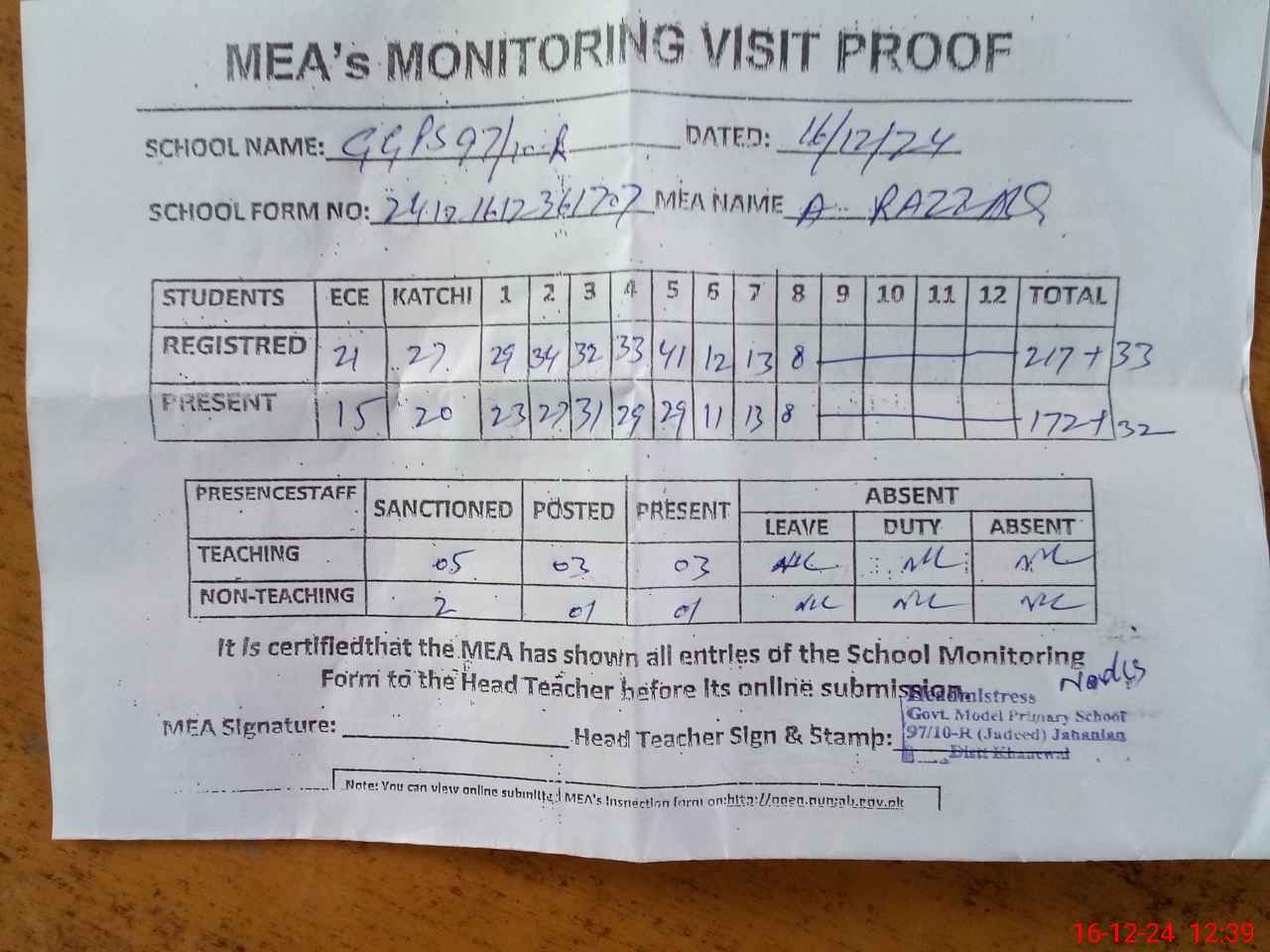 | Attendance Register | Head Teacher | MEA with School | Visit Proof |