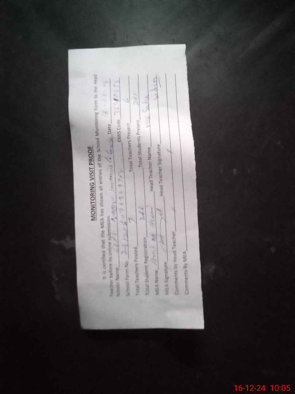 | Attendance Register | Head Teacher | MEA with School | Visit Proof |