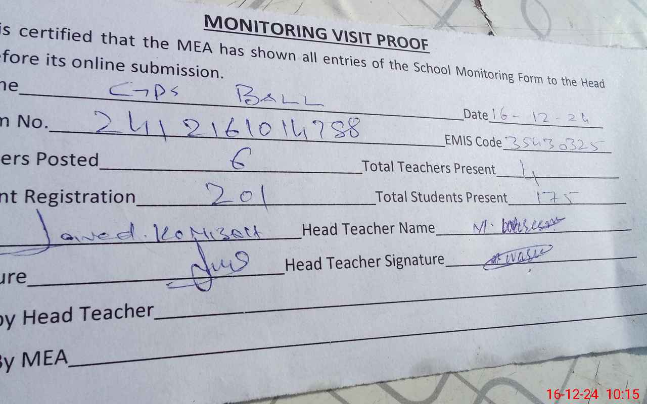 | Attendance Register | Head Teacher | MEA with School | Visit Proof |
