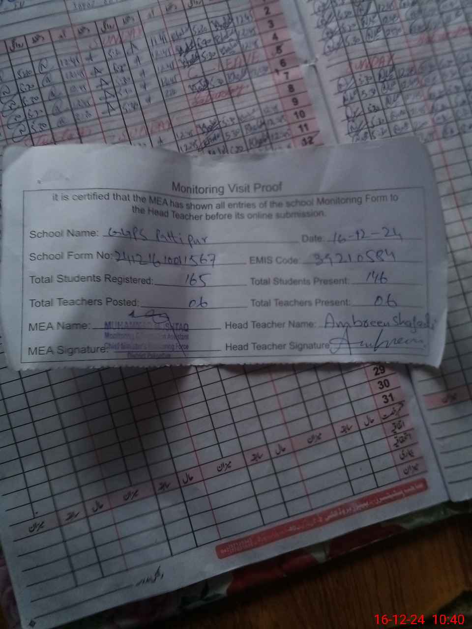 | Attendance Register | Head Teacher | MEA with School | Visit Proof |