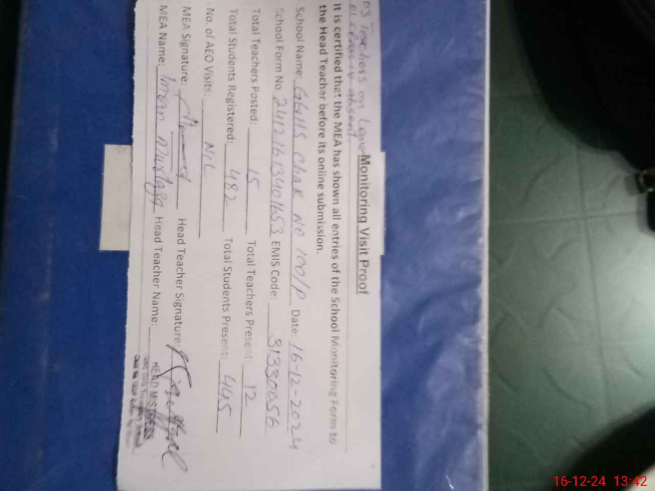 | Attendance Register | Head Teacher | MEA with School | Visit Proof |
