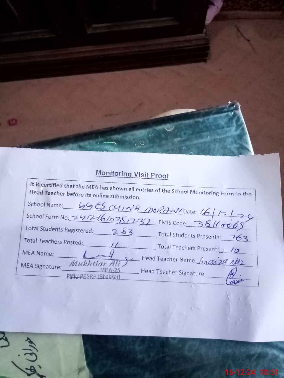 | Attendance Register | Head Teacher | MEA with School | Visit Proof |
