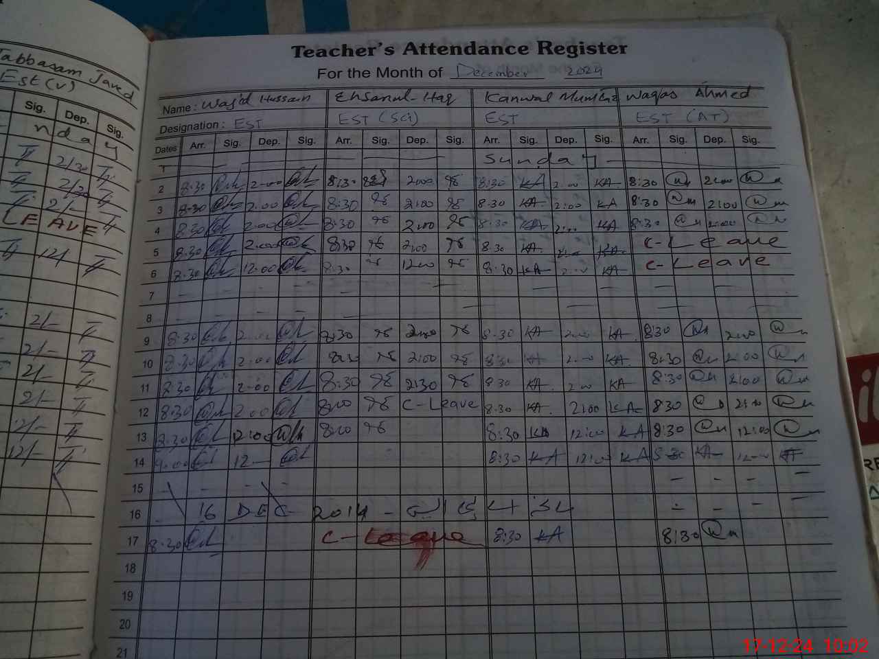| CNIC | Full Name | Designation | R/C | Absence During Last Calender Month |