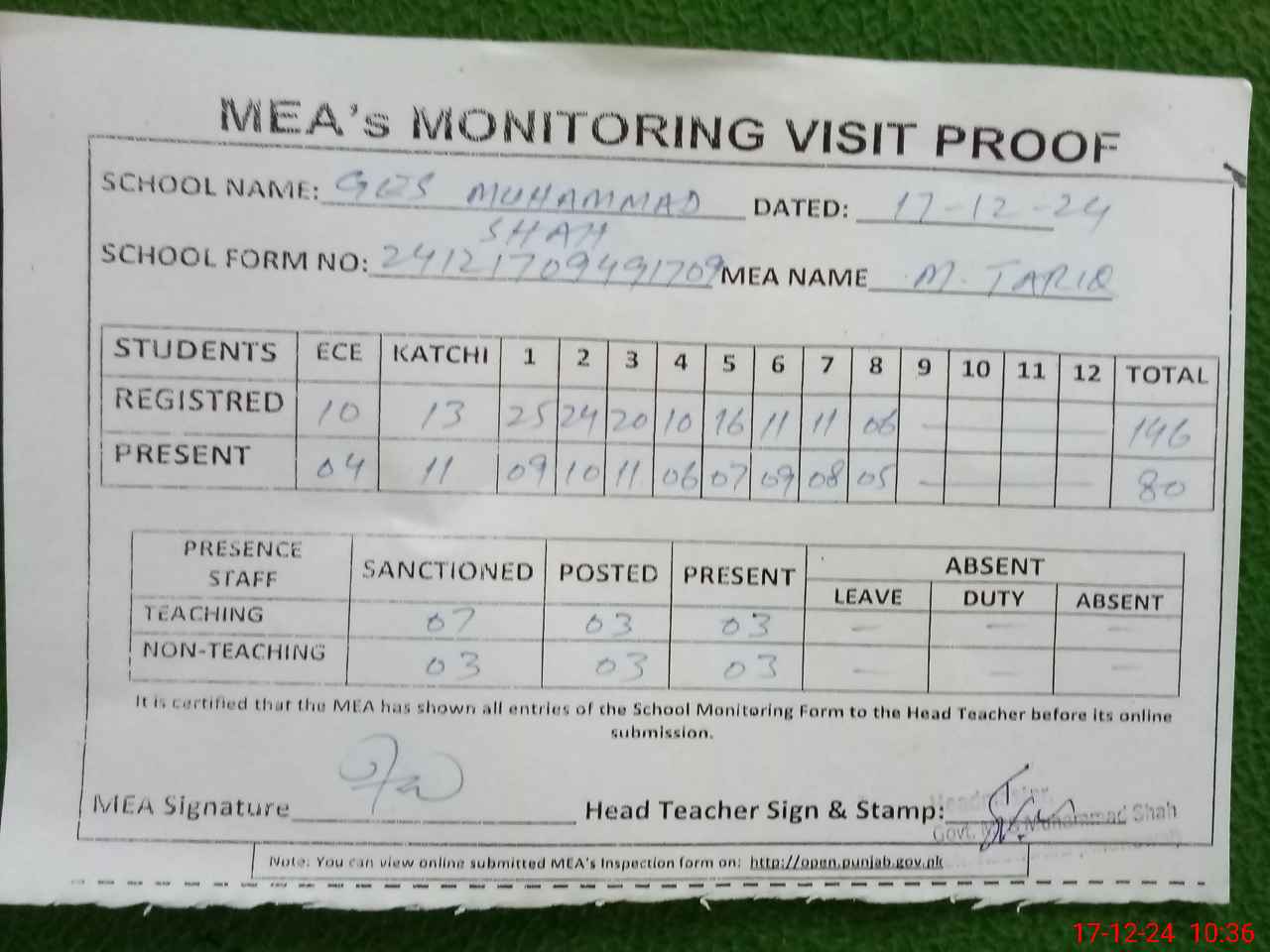 | Attendance Register | Head Teacher | MEA with School | Visit Proof |