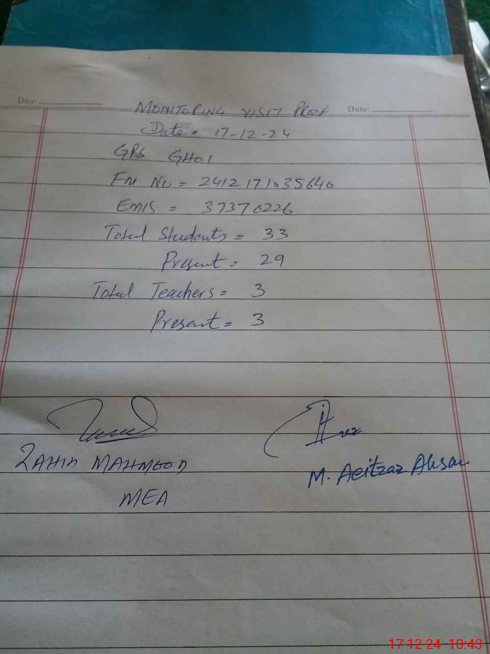| Monitoring Date: 17-12-2024 | Start Time: 17-12-2024 10:30 AM | End Time: 17-12-2024 10:47 AM | Name of MEA: Za**** Me**** | |