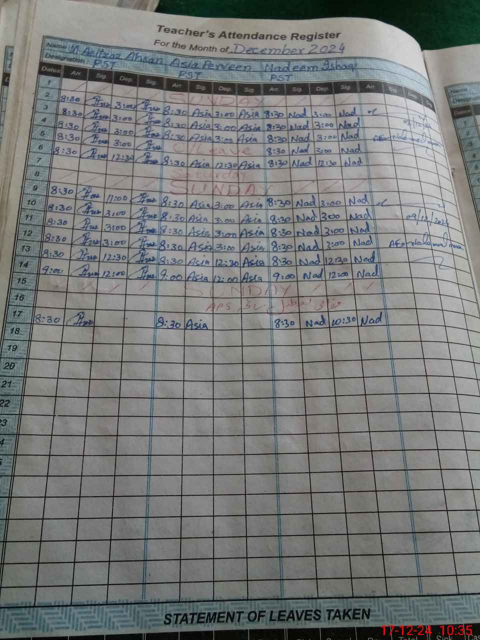| Leave | Duty | Absent | Maternity | Medical | Ex- Pak |