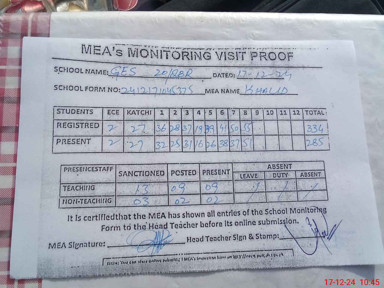 | Attendance Register | Head Teacher | MEA with School | Visit Proof |