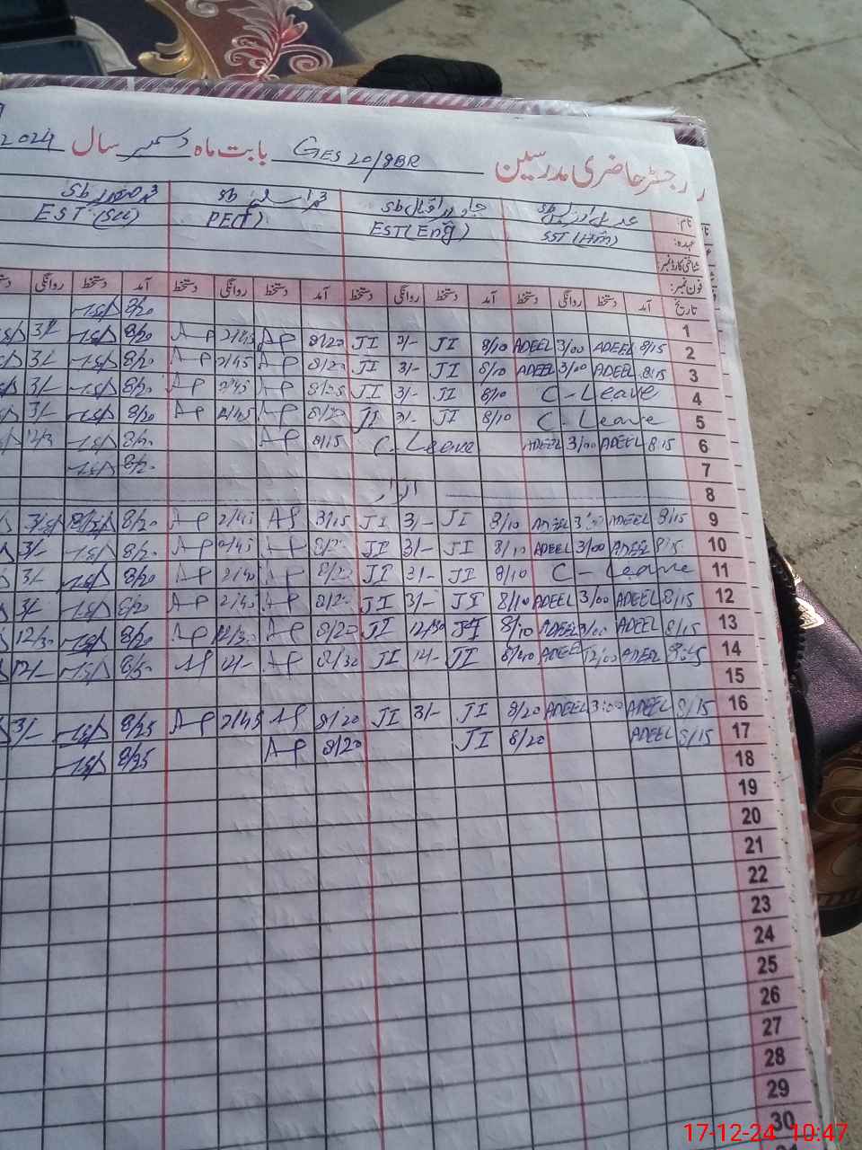 | CNIC | Full Name | Designation | R/C | Absence During Last Calender Month |