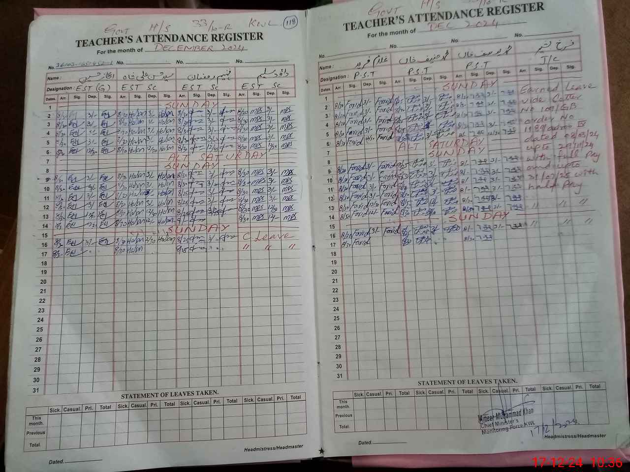| Remarks (Use Separate Page if Required): JC Farukh B ashir on earned leave wef 8 March 2024 up to 31 July 2025 with half salary SSE Ahsan Nadeem on emergency leave due an accident today his casual leave being not sectioned on sis due app failure The whole building of school is being is going to a dangerous School are not be sitting in class rooms due bad condition | |||||
