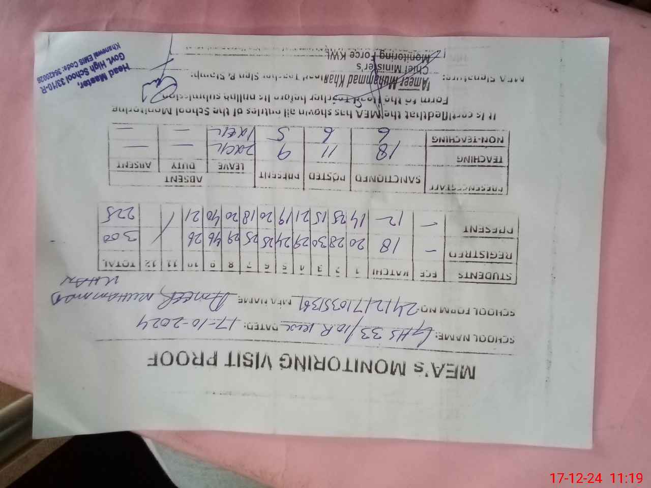 | Monitoring Date: 17-12-2024 | Start Time: 17-12-2024 10:08 AM | End Time: 17-12-2024 11:19 AM | Name of MEA: Am**** Mu**** Kh**** | |
