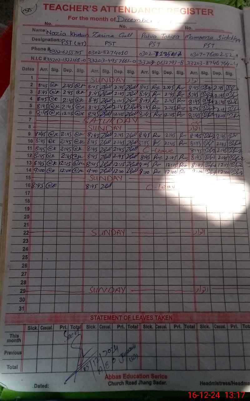 | CNIC | Full Name | Designation | R/C | Absence During Last Calender Month |