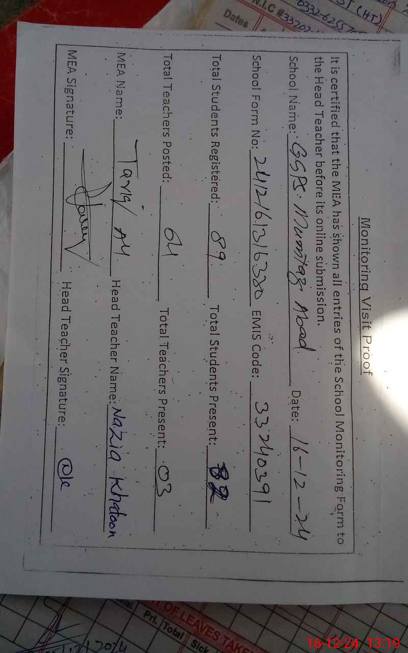 | EMIS Code: 33240391 | Name of School: GGPS MUMTAZ ABAD | |||