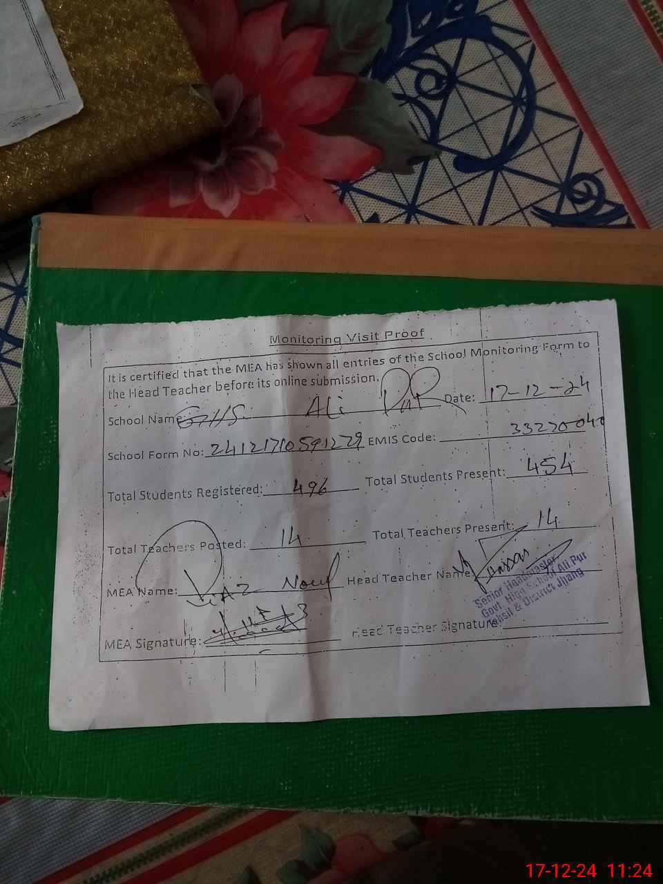 | EMIS Code: 33220040 | Name of School: GHS ALI PUR | |||