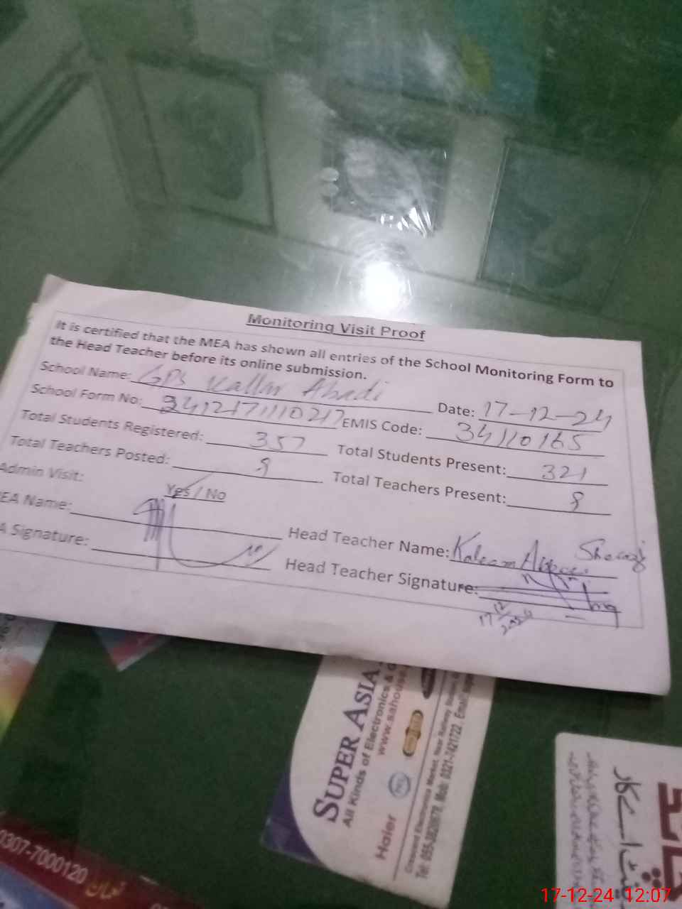 | Attendance Register | Head Teacher | MEA with School | Visit Proof |