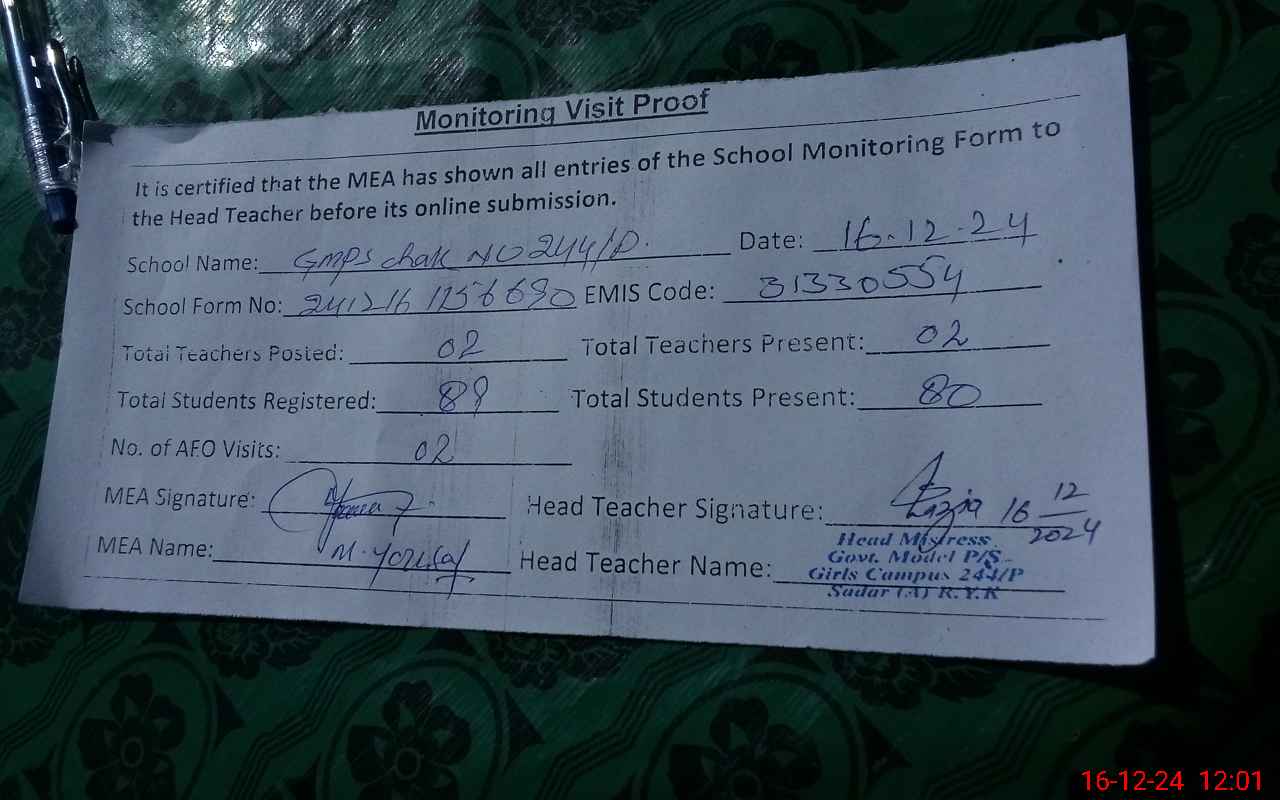 | EMIS Code: 31330554 | Name of School: GMPS CHAK 244/P | |||